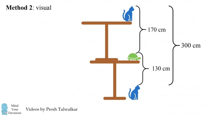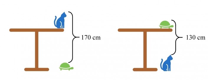 Согласно условиям задачи ученикам предлагается вычислить высоту стола, при условии что расстояние от головы черепахи, сидящей под ним, до головы кота на столе составляет 170 сантиметров, а расстояние от головы кота, сидящего под столом, до головы черепахи на столе - 130 сантиметров.