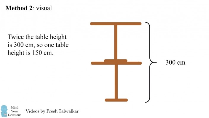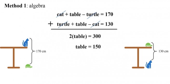Второй - мысленно наложить оба стола друг на друга и опять же "сократить" животных. Таким образом, мы получаем высоту стола, это 150 сантиметров.