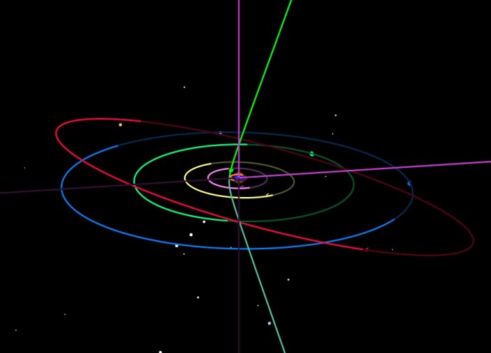 Траектория кометы Борисова выделена зеленым и сине-зеленым, хорошо видно, что она проходит через Солнечную систему насквозь. © Orbitsimulator.com