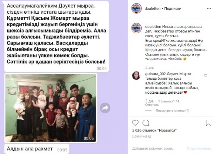 Дәулет Төлейтайұлының тағы бір жазбасында Сарыағаш қаласында тұратын Тәжібаевтар отбасы несиені жауып бергені үшін Президент Қасым-Жомарт Тоқаевқа алғыс білдірген.