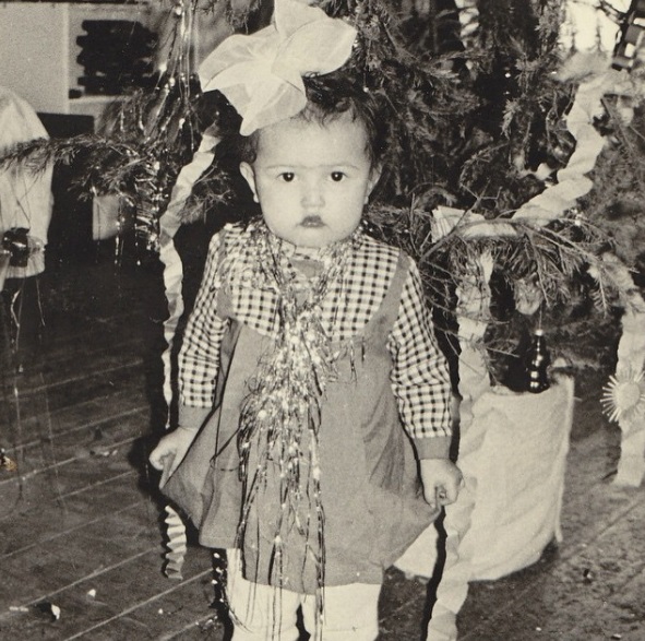 "Возле елочки девочка в клетчатом платье с дождиками", - описывает фотографию в соцсетях она.