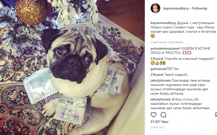 В Instagram продюсера Баян Алагузовой также появились праздничные фотографии. Одна из них с домашним питомцем - собакой по кличке Мэлоу, обмотанной денежными купюрами.