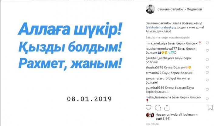 "Жаратқанға мадақ! Ақбота-нұр маған қыз сыйлады! Әлхамдулиллах", - деп жазды ол парақшасында.