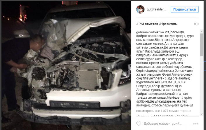 В свою очередь, директор Кайрата Нуртаса Лаура Сейтбекова сообщила подробности аварии. По ее словам, певца везли на концерт в райцентр Казалы в Кызылординской области на автомобиле, предоставленном акиматом. "В этой машине ехали сам Кайрат, его администратор и водитель. Кайрат сидел на переднем сидении. Причину ДТП точно не могу сказать, по-моему, по словам водителя, они ехали ночью и сбили лошадь. У Кайрата был ушиб коленей. Он забинтовал ноги и, невзирая на боль, выступил перед народом. На следующий день он сделал рентген, кости все были целы. Сейчас Кайрат уже чувствует себя хорошо. Вчера дали сольный концерт в Туркестане, сегодня еще один концерт будет. Гастроли продолжаются", - рассказала она.