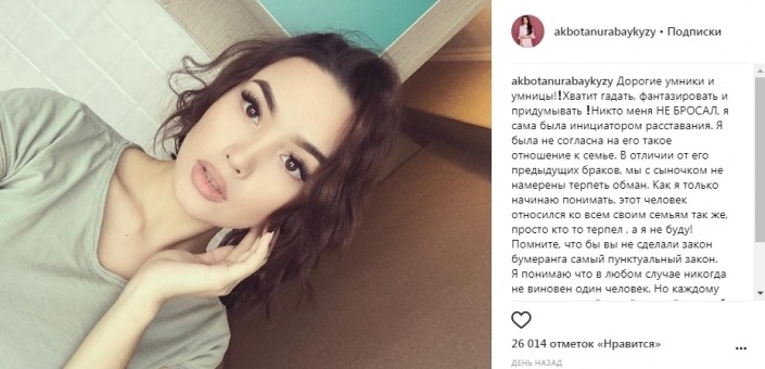 Напомним, в конце 2016 года в Казнете активно обсуждался роман Акботы с 34-летним КВНщиком и шоуменом Дауреном Айдаркуловым. Тогда сообщалось, что ради молодой девушки Даурен бросил жену и троих детей. Именно этот факт разозлил многих пользователей соцсетей. Комментаторы набросились на них с критикой: Акботу обвиняли в том, что она разрушила чужую семью, а КВНщика в том, что он решился бросить родных детей. 1 июня у скандальной пары родился ребенок. Также сообщалось, что Айдаркулов и Сейтмагамбет поженились.