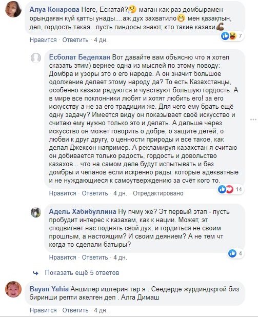 "Не айтқым келгенін түсіндірейін. Домбыра мен ою өз халқы туралы. Сонда ол өз халқына міндет қылады, солай ма? Яғни қазақстандықтар, әсіресе қазақтар қуанып, кеудесін мақтаныш кернейді. Ал әлемде жанкүйерлері оны жақсы көреді, жақсы көргісі келеді. Оның дәстүрі үшін емес, оның өнері үшін. Меніңше, ол бір ғана нәрсемен айналысуы керек, өнерін ғана көрсету. Ал әрі қарай өнер арқылы ол жақсылық, балаларды қорғау, өзара махаббат, табиғаттың құндылығы және сол сияқты айтуына болады. Майкл Джексон секілді, мәселен. Ал Қазақстанды жарнамалау арқылы ол қазақтардың қуанышын, мақтанышын және көңілінің толуына ғана жетіп отыр. Адекват әрі өзгенің жетістігі арқылы айызын қандырмайтындар домбыра мен шапансыз-ақ осылай қуанышты бола алады".