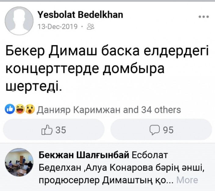 Бастапқыда Есболат Беделхан Facebook желісіндегі парақшасында Димаштың басқа елдердегі концерттерінде бекер домбыра шертетінін айтқан. Алайда пікір жазғандар одан ойын толығырақ жазуын өтінген.