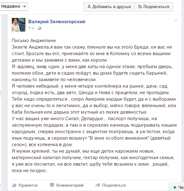 "Дорогой Бредушка, - начинает она свое письмо в социальной сети Facebook. - Когда я услышала новость о твоем разводе, на душе моей запели соловьи и зацвела сирень. Никогда я так не была близка к своему счастью, как сейчас".