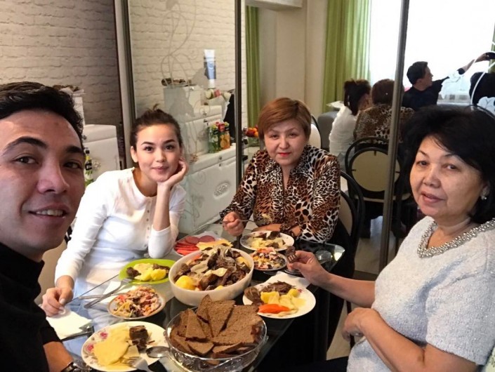 На снимках Акбота позирует со своим партнером по фильму "Гламур для дур". Одно фото сделано в Туркестане, на другом певица в платке, как бы изображая келин. На третьем снимке пара обедает, предположительно вместе с родителями.