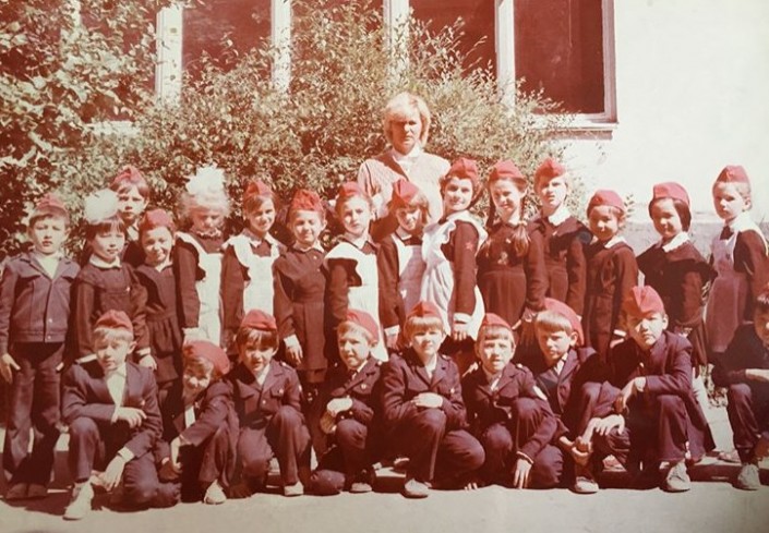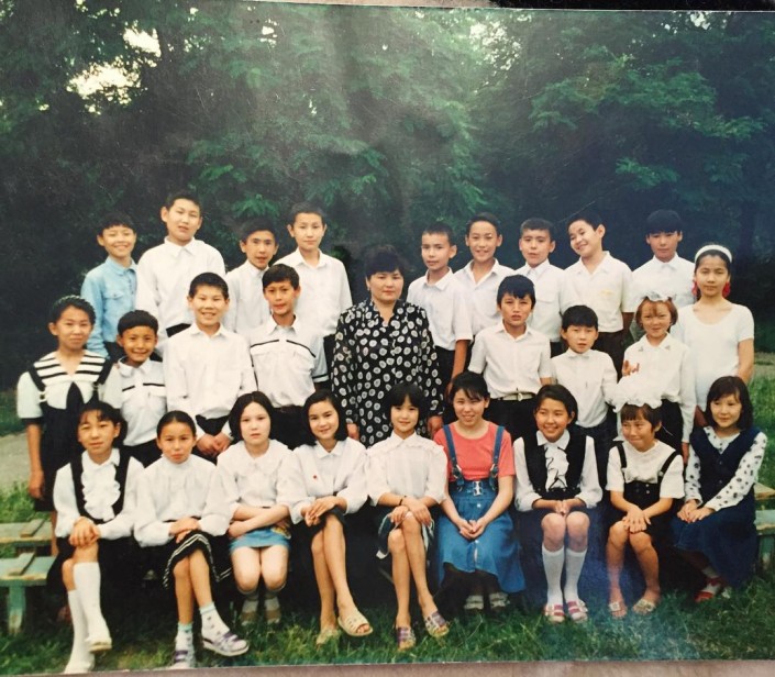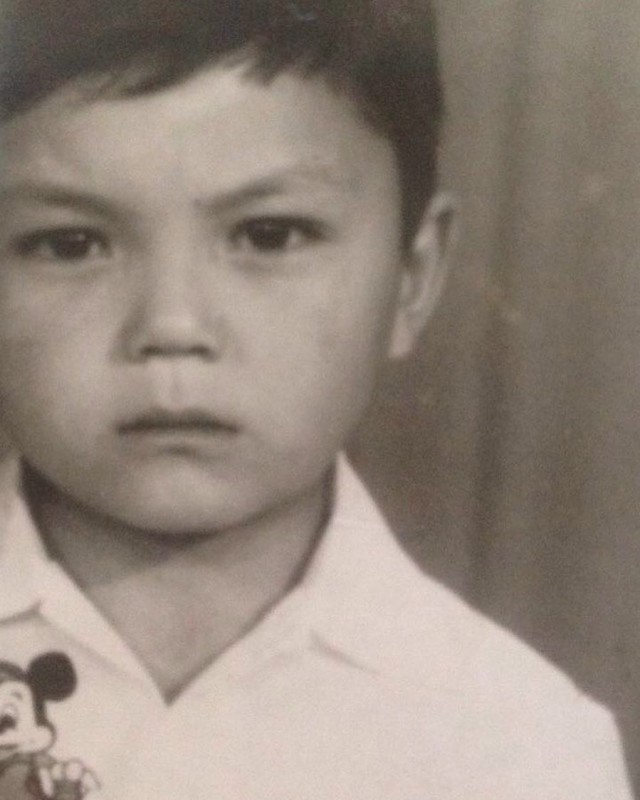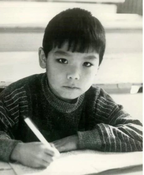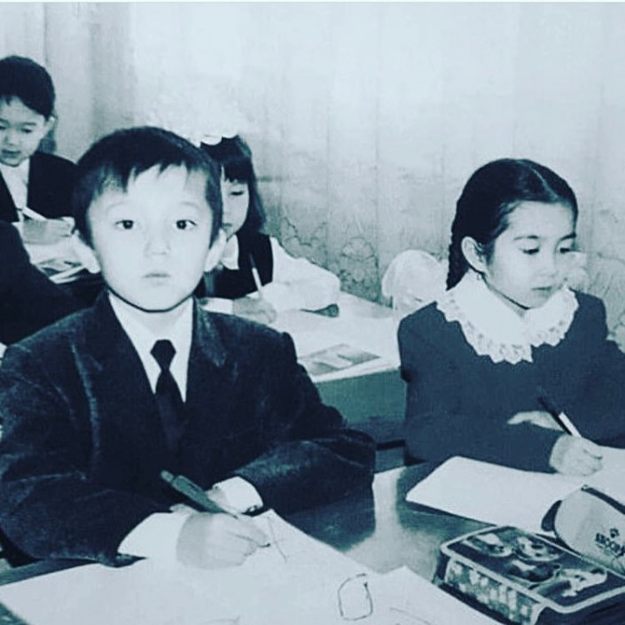 "Қазақстан, Ақтөбе қаласы, 32-мектеп гимназиясы, 1-сынып. 2, 3, 4 деген баға алатын балалар, жаман балалар, деп ойлайтын кезім. Мектепте ұнатып қалған қыз үшін ұлдармен төбелесетін кез ғой! Бақытты балалық шағым үшін: ата-анама, мектебіме, ұстаздарыма рақмет!!!! Ностальгия...", - деп жазған әнші жариялаған суретінің сипаттамасына.