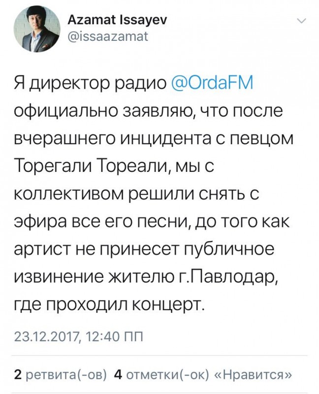 "Я директор OrdaFM официально заявляю, что после вчерашнего инцидента с певцом Торегали Тореали, мы с коллективом решили снять с эфира все его песни, до того как артист не принесет публичные извинения жителю города Павлодар, где проходил концерт", - написал Исаев в Twitter.
