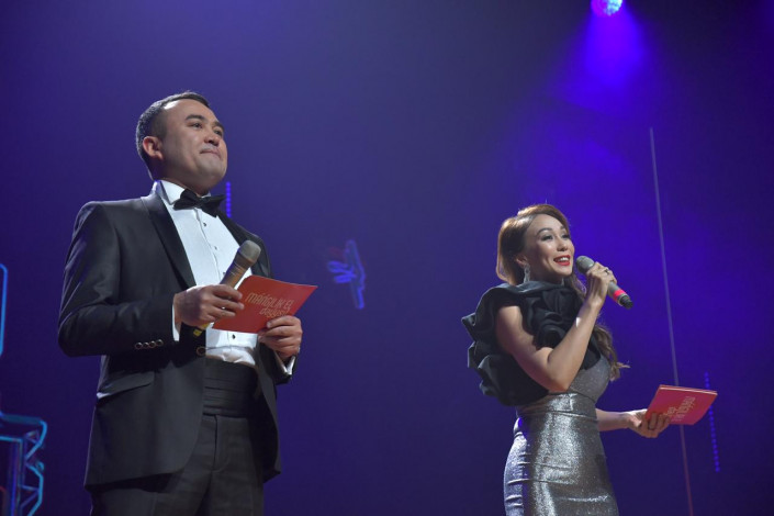 19.34 Зрителей приветствуют ведущие вечера - программный директор национальной радиостанции "Жулдыз FM" Жасулан Кали и казахстанская актриса и телеведущая Нурбигуль Егизова.
