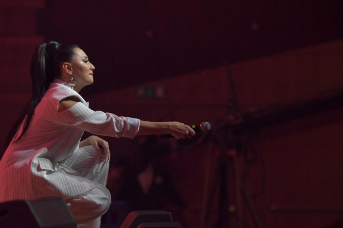 20.30 На сцене в красивом одеянии с национальными узорами Ерке Есмахан с песней "Сандуғаш". После она a-capella поет с залом народные песни.