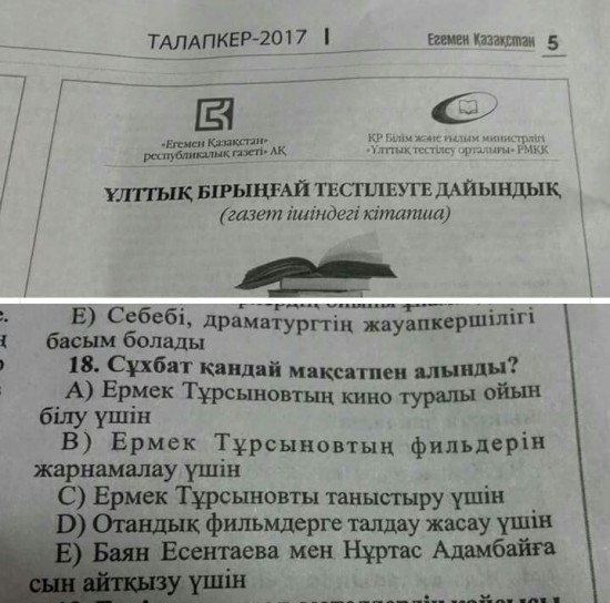 Задания Единого национального тестирования были опубликовали в республиканской газете. В одном из них авторы использовали интервью казахстанского режиссера Ермека Турсунова. Речь в нем шла о Есентаевой и Адамбаеве. А к интервью прилагались вопросы.