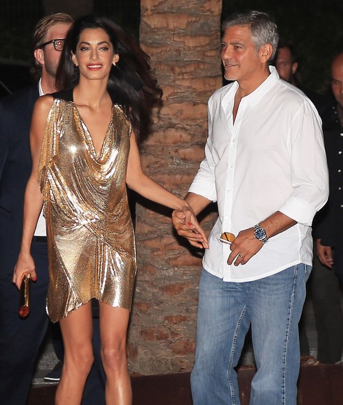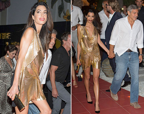 На вечеринке на испанской Ибице возлюбленная Клуни появилась в коротком золотистом наряде из струящейся ткани и тем самым привлекла внимание прессы. Столь пристальное внимание к Аламуддин объясняется тем, что известного адвоката привыкли видеть в классических костюмах и более скромных нарядах.