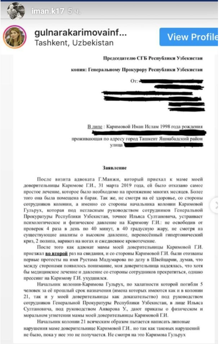 Дочь Гульнары Каримовой Иман опубликовала в Instagram заявление, написанное на имя главы Службы государственной безопасности (СГБ) и генерального прокурора Узбекистана. Об этом сообщает CA-NEWS, передает Tengrinews.kz
