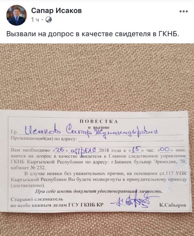 Бывшего премьер-министра Кыргызстана Сапара Исакова вызвали на допрос в Главное следственное управление Комитета национальной безопасности (ГКНБ). Об этом Сапар Исаков написал на своей страничке в Facebook, приложив фото повестки спецслужб, передает корреспондент Tengrinews.kz. В повестке отмечается, что в случае неявки Исакова он будет доставлен на допрос принудительно.