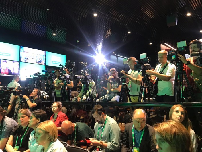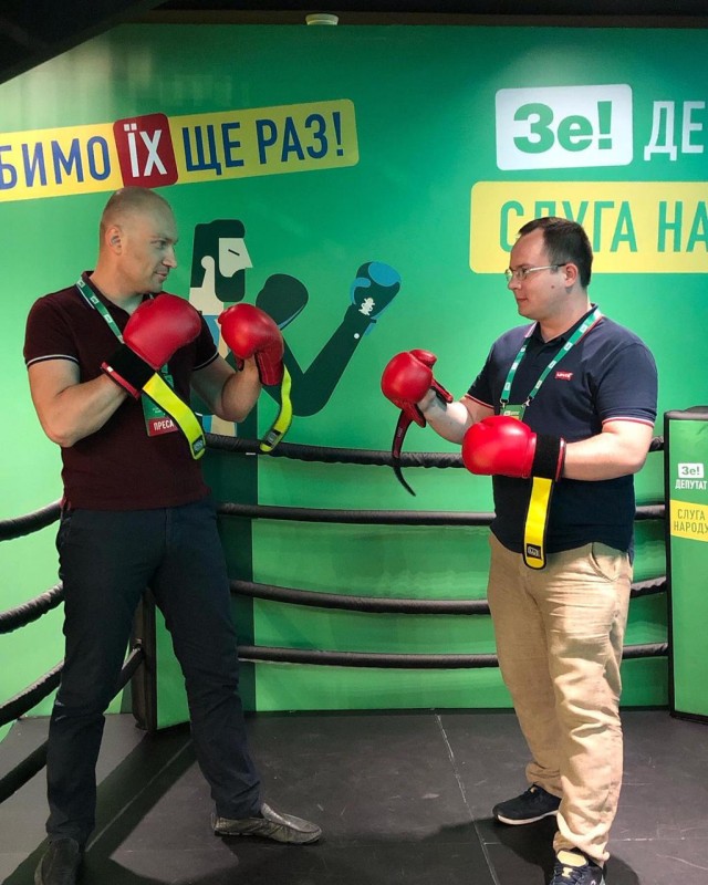 "Слуги народа" принимали хорошо, о чем не стеснялись говорить видевшие разные приемы украинские журналисты. После тяжелого рабочего дня на избирательных участках бесплатные пицца, гамбургеры, сыры, картошка фри, салаты и множество напитков (включая алкоголь на баре) были как нельзя кстати. Уж явно в диковинку были настольные игры (теннис, футбол) и фототочка в стиле боксерского ринга - все это проходило непринужденно с перерывами на блицы со спикерами партии. Для удобства журналистов в каждом помещении было табло, на котором включали обратный отсчет до начала пресс-конференции того или иного спикера.