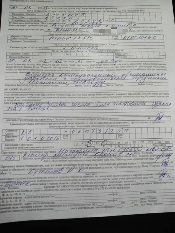 По данным пресс-службы ГУОБДД МВД, в отношении водителя авто был составлен административный протокол. "Сотрудниками ГУОБДД МВД водитель Бутешов Аслан привлечен к административной ответственности по части 4 статьи 228 КоАО Кыргызской Республики", - уточнили в ГУОБДД.