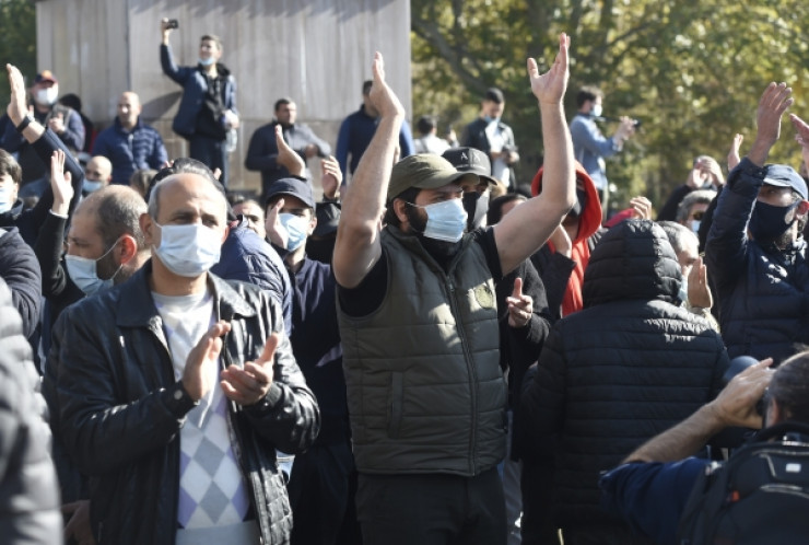 Собравшиеся считают "предательством" подписание соглашения о прекращении огня в Карабахе с территориальными уступками.