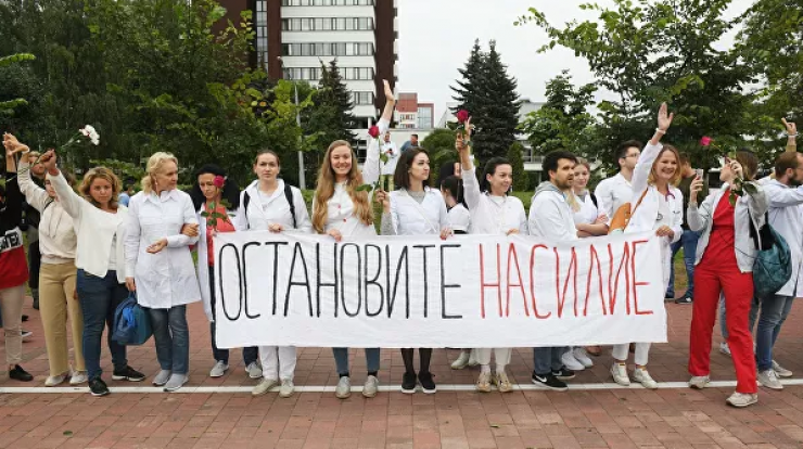 Также в Беларуси активно проходили акции против насилия силовиков по отношению к протестующим. Одну из таких акций устроили около Белорусского государственного медицинского университета на проспекте Дзержинского около 200 медработников. Многие из них были одеты в белые халаты. Они выстроились в "цепочку солидарности", держа в руках плакаты "Врачи против насилия", красные и белые цветы. К участникам акции вышел министр здравоохранения Беларуси Владимир Караник, он предложил поговорить, однако медики отказались идти за чиновником, сообщает РИА Новости.