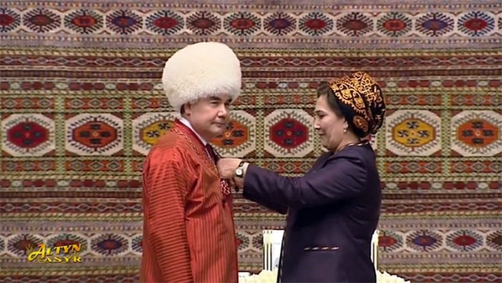 Перед вручением нагрудного знака Бердымухамедов переоделся в традиционную туркменскую одежду - дон и белый тельпек.