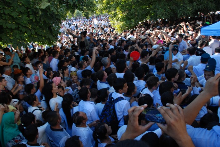 Когда вечером наконец-то началась раздача плова, организованная очередь превратилась в давку всего за несколько минут. Вот как описывает случившееся издание: "Люди хотели первыми попробовать "тот самый плов", поэтому ринулись брать штурмом огромные казаны. В толпе оказались дети, которых чудесным образом высвободили из сутолоки: мужчины выносили их на руках. Ажиотаж усилился после того, как в толпе стали разноситься слухи, что плов заканчивается. Однако на заверения организаторов уже никто не обращал внимания. Давка лишь усугублялась. Одновременно с этим гости накинулись на аккуратно сложенные горы фруктов и бахчевых. Неуправляемая толпа буквально снесла все на своем пути. В тот же день в социальных сетях появились видеофрагменты нелицеприятного поведения горожан, оставивших после себя горы мусора и раздавленных фруктов".
