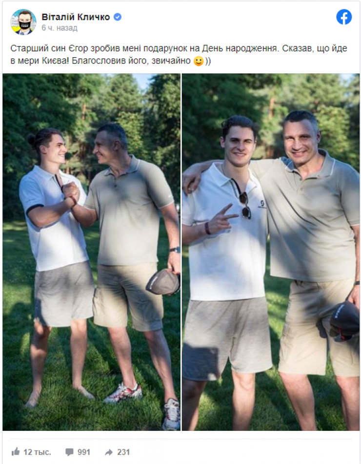 Кличко опубликовал фото с сыном и сказал, что решение сына пойти в мэры Киева стало для него подарком на день рождения.
