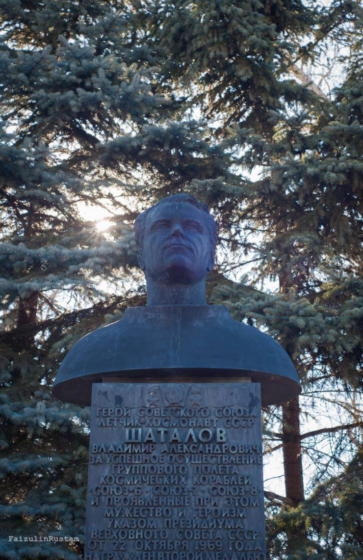 В Петропавловске у входа в парк культуры и отдыха находится бюст Владимира Шаталова.