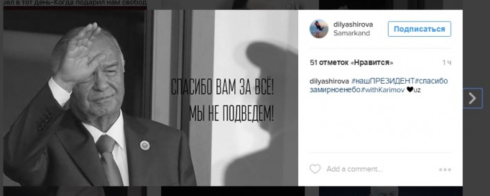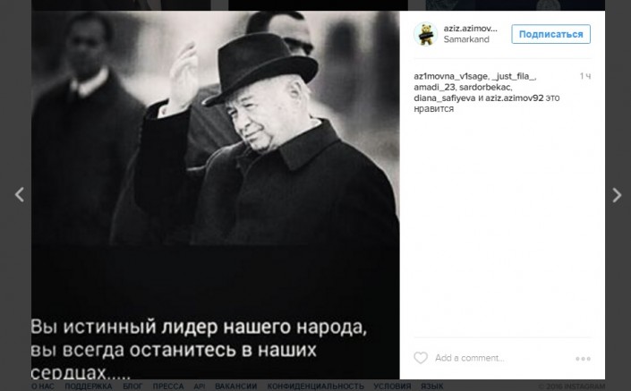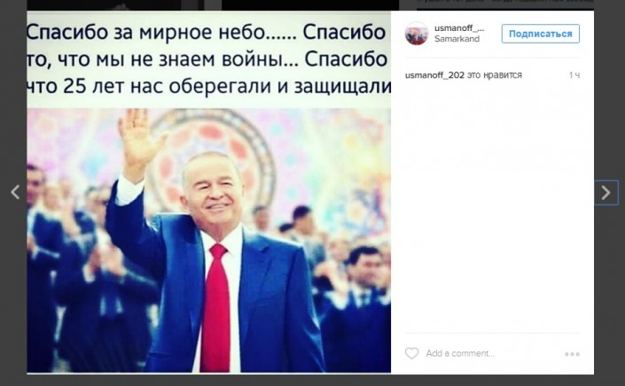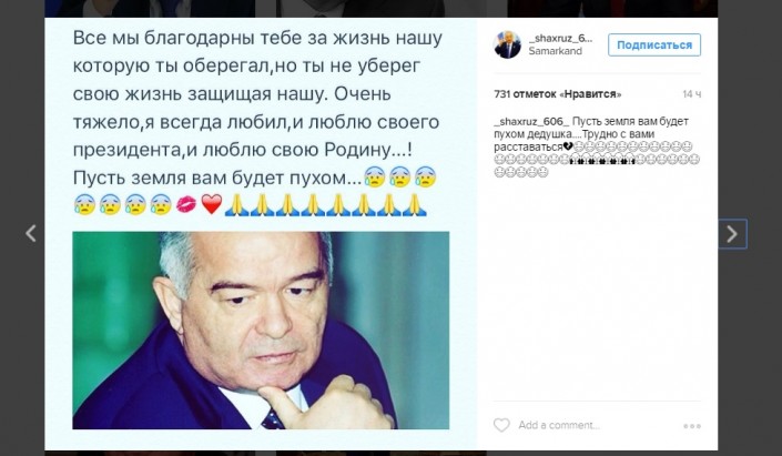 Пользователи Instagram из Ташкента и Самарканда выкладывают в социальной сети фотографии президента Узбекистана. Многие благодарят Ислама Каримова за мирное небо над головой, за независимость. "Будем помнить вас", "Он ушел в тот день, когда подарил нам свободу", - отмечают пользователи.