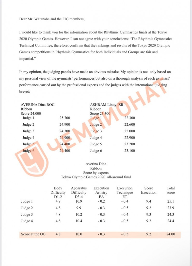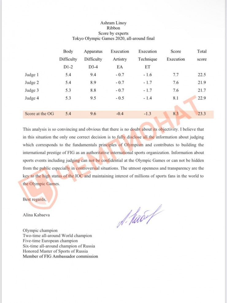 Олимпийская чемпионка по художественной гимнастике Алина Кабаева обратилась к президенту Международной федерации гимнастики (FIG) Моринари Ватанабэ с письмом, в котором называет итоги Олимпиады в Токио в области художественной гимнастики ошибочными и просит раскрыть всю информацию о действиях судей. Текст обращения оказался в распоряжении "Чемпионата", передает Tengrinews.kz.