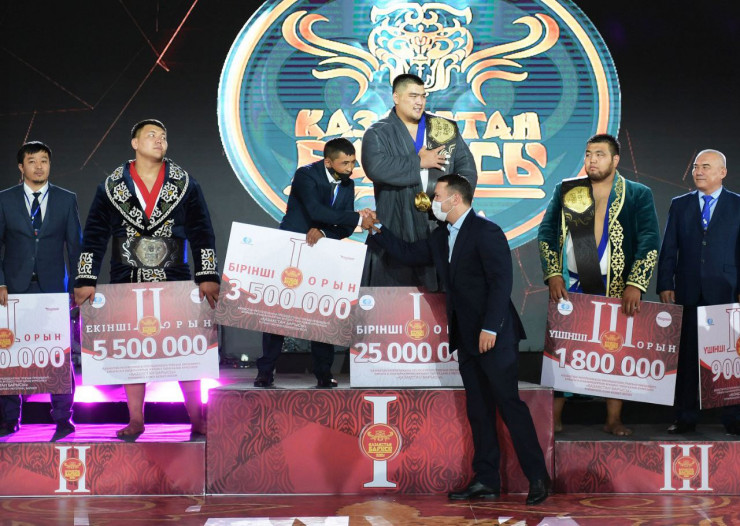 Галымжан Кырыкбай получил денежное вознаграждение в размере 5,5 миллиона тенге и серебряный пояс. Обладателю третьего места - борцу из Мангистауской области Нурдаулету Жарылгапову вручили 1,8 миллиона тенге и бронзовый пояс.