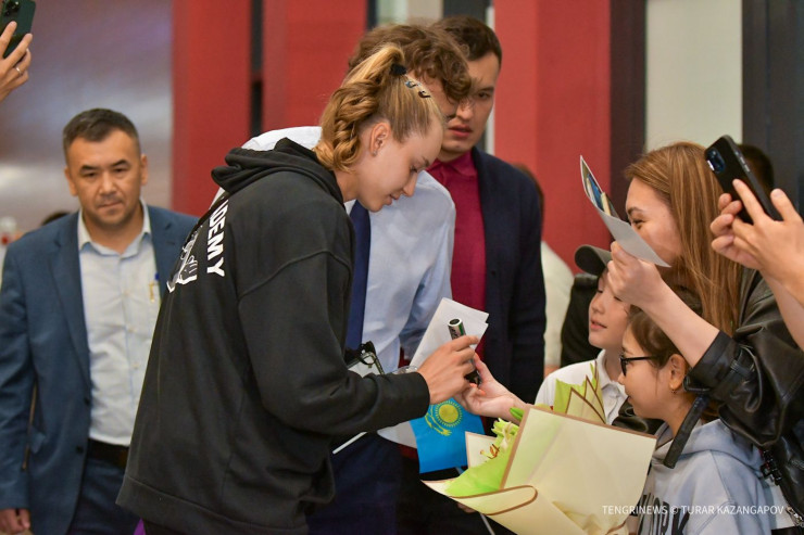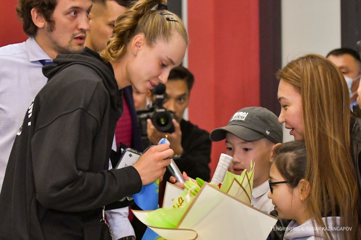 "Казахстан тобой гордится!" - такой плакат развернули встречающие фанаты. Теннисистка оставила несколько автографов юным болельщикам, а также попробовала национальные казахские угощения - кумыс и баурсаки.