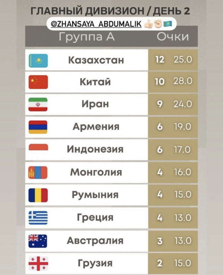 Теперь Казахстан лидирует в топ-дивизионе на онлайн-олимпиаде с 12 очками, опережая Китай на два балла. Казахстанским шахматистам осталось провести еще три игры в группе - с Ираном, Монголией и Австралией.