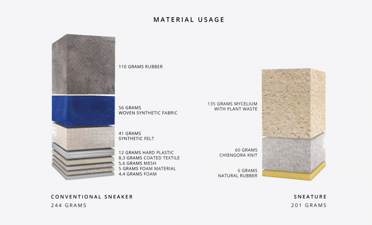 Кроссовки Sneature состоят только из трех возобновляемых материалов, что позволяет легко их перерабатывать или быстро разлагать. Для сравнения, традиционные кроссовки обычно состоят из примерно 8-12 различных компонентов, таких как нейлоновая ткань и пена этилен-винилацетат (EVA), многие из которых имеют нефтяную основу и могут пролежать на свалках до тысячи лет. Из-за их сложной конструкции практически невозможно разобрать и переработать обычные кроссовки.
