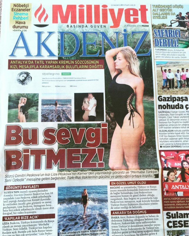 18-летняя дочь пресс-секретаря президента России Дмитрия Пескова Лиза оказалась на первых полосах турецких газет. Фотографии обложек турецких газет опубликовала у себя в Instagram мама Лизы - бывшая жена Пескова Екатерина.