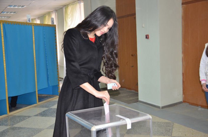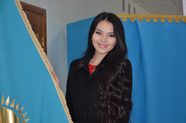 Алия Мергембаева, завоевавшая в прошлом году титул самой красивой девушки Казахстана, в выборах участвует впервые, так как 18 лет ей исполнилось в январе этого года. Отдать свой голос девушка пришла на избирательный участок №27, расположенный в средней школе №13 города Актау.
