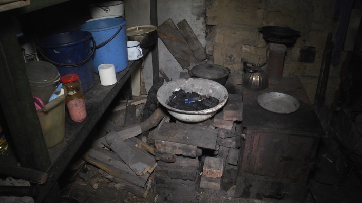 В гараже нет никаких коммунальных благ. Электричество мужчине заменяют  керосинка или аккумулятор, воду привозит. Тут же стирает и сушит вещи. Дрова собирает на улице, уголь покупает мешками или заказывает машину. Пристроил  углярку к гаражу. Печку нужно топить каждые три часа, больше тепло не держится. На печке же и готовит.