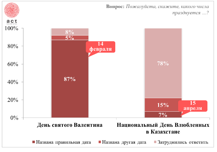 Среди опрошенных 87 процентов респондентов смогли назвать точную дату празднования Дня святого Валентина (14 февраля), тогда как точную дату празднования национального Дня влюбленных в Казахстане (15 апреля) назвали только 7 процентов респондентов.