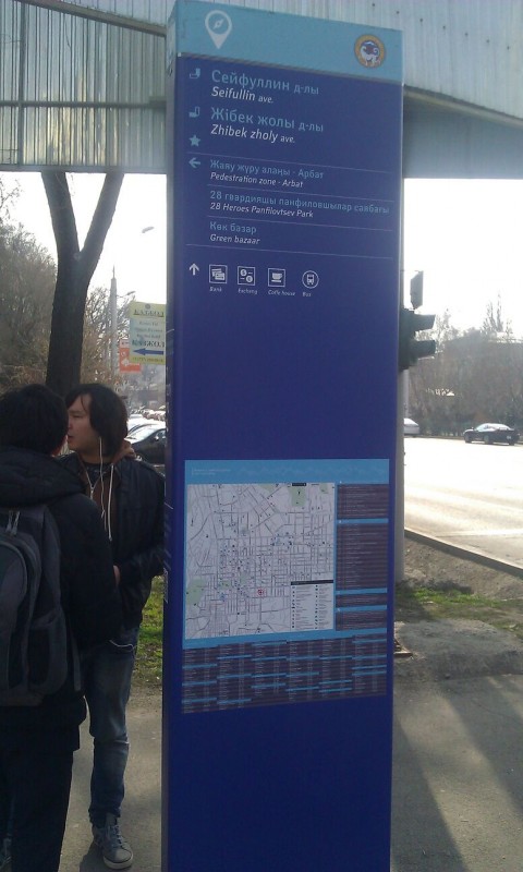 На пересечении проспекта Сейфуллина и улицы Толе би установлен похожий информационный стенд. Однако нижняя часть, где должны были располагаться указатели "Exchаngе" и "Coffeе house", отсутствует.