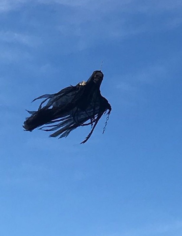 В социальных сетях разошлись фотографии летящего в небе скелета в черном балахоне и с цепями, сообщает "Вести.Ru".