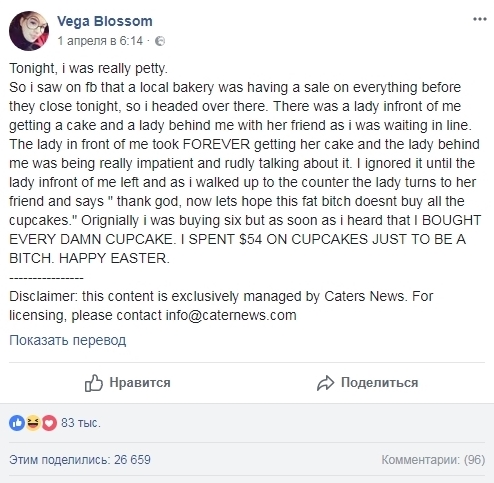 От обидных слов девушка едва не расплакалась, но на выпад ничего не ответила. Вместо этого она решила научить грубиянок уважать других и вместо запланированных шести капкейков купила все оставшиеся.