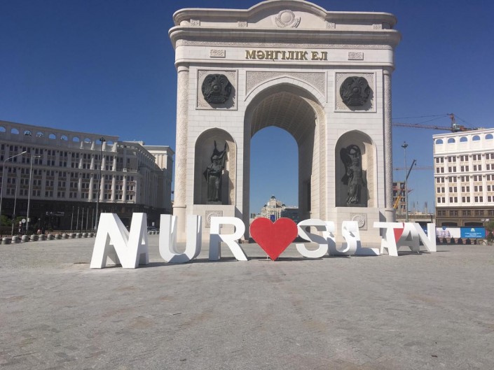 Декорацию можно увидеть перед монументом со стороны проспекта Ұлы Дала. Объект установлен таким образом, что при взгляде с одной стороны видно надпись Nur-Sultan. Посмотрев на арку с западной стороны, можно увидеть I Love Astana.