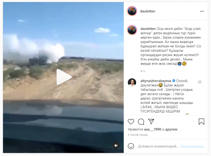 "Осы кезге дейін "бізді улап жатыр" деген видеоның түр-түрін көрген едім... Бірақ оларға күмәнмен қарайтынмын. Ал мына видеода бұрқырап жатқан не болды екен? Сіз қалай ойлайсыз? Құзырлы органдардан ресми жауап күтеміз!!! Егін алқабы дейін десем... Мына жерде егін жоқ секілді", - дейді Дәулет Мұқаев.