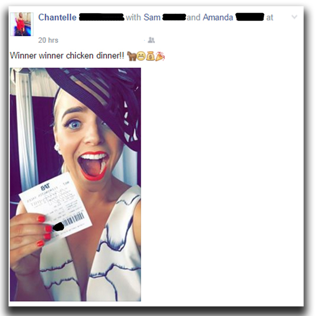 Жительница города Перт по имени Шантель впервые в жизни отправилась на лошадиные скачки на Кубок Мельбурна, где решила сделать несколько небольших ставок. Девушка поставила сто к одному на одну из лошадей, которая принесла ей солидный выигрыш. Свою радость счастливица решила разделить с друзьями на Facebook и сфотографировалась с выигрышным билетом, не подумав о том, что в кадр попал штрих-код, необходимый для получения наличных.