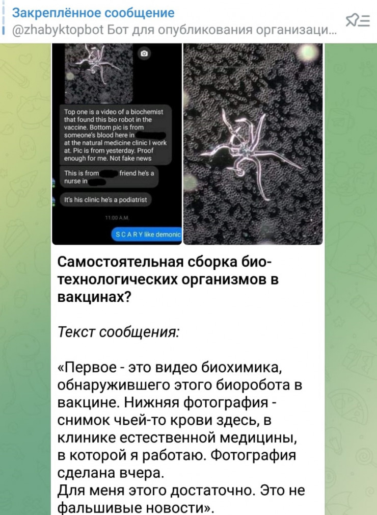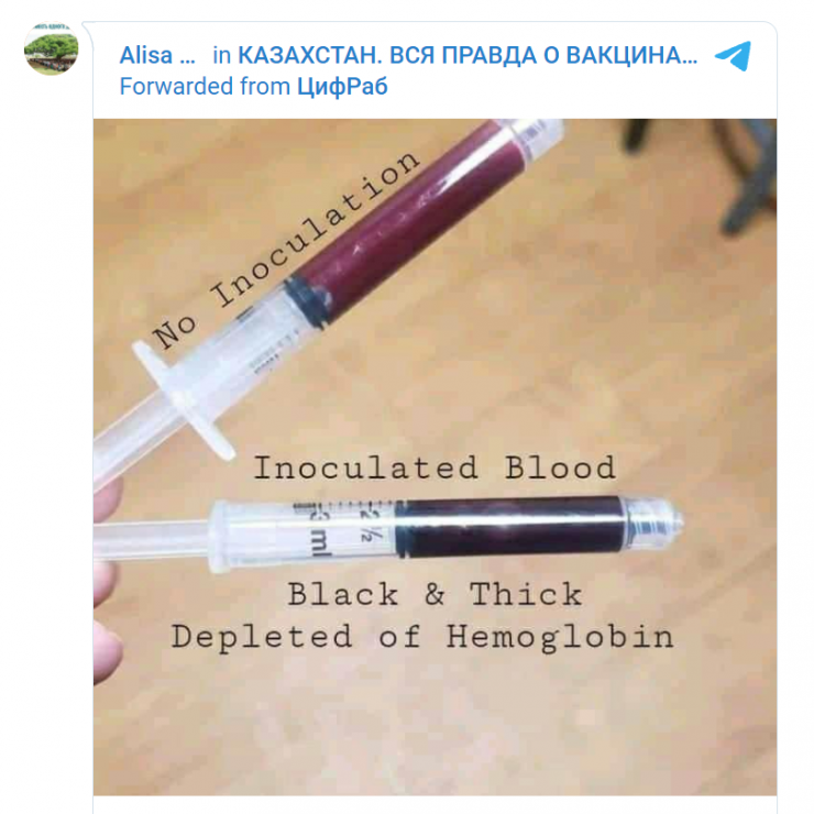 Telegram-да коронавирусқа қарсы егілген адамдардың қаны вакцина салдырмағандардың қанынан ерекшеленетіні туралы хабарлама тарады. Екпе алған адамдарда қан түсі қою қызыл, қоңыр реңкті болады-мыс.