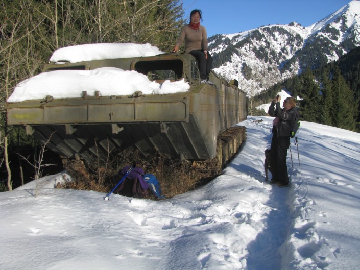 "Думаю, что этой машине лет 40-50... Но железо еще крепкое, почти без следов ржавчины!" - пишет он. Блогер сделал предположение о том, как ПТС-М оказался на этом месте. "По фильмам и публикациям СМИ не раз видел, как такие машины участвовали в спасательных операциях при наводнениях, разливах рек. На ПТС-М переправляли людей, животных, домашний скарб... Для чего вездеход-амфибия в горах?.. Думаю, его доставили сюда для расчистки горных склонов от поваленного майским ураганом 2011 года леса...", - сообщает Есимов в своем блоге. При этом, по его словам, доставить в горы 18-тонный ПТС-М было бы довольно сложно.