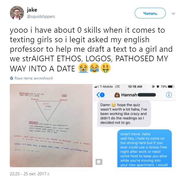 Как рассказал Джейк, он хотел пригласить девушку по имени Ханна на ужин, однако не знал, как правильно это сделать. Тогда парень попросил помощи у профессора университета, который посоветовал прибегнуть к методике убеждения и использованию риторических категорий - этоса, пафоса и логоса. Вместе с преподавателем они изучили жизнь Ханны и заметили, что она переезжает в новую квартиру, много работает, любит китайскую еду и у нее есть собака.
