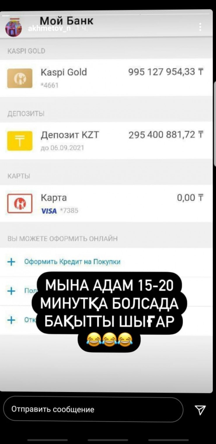 Сонымен қатар, желіде осы жағдайға қатысты түрлі әзіл тарап жатыр. Мысалы, Kaspi.kz қосымшасынан жасалған скриншот тараған. Онда белгісіз бір адамның шотында бір миллиард теңгеге жуық ақша тұр.
