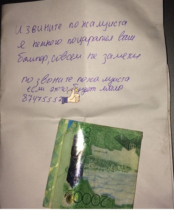 "Извините, пожалуйста. Я немного поцарапал ваш бампер, совсем не заметил. Позвоните, пожалуйста, если этого будет мало", - написал водитель, приложив две тысячи тенге.